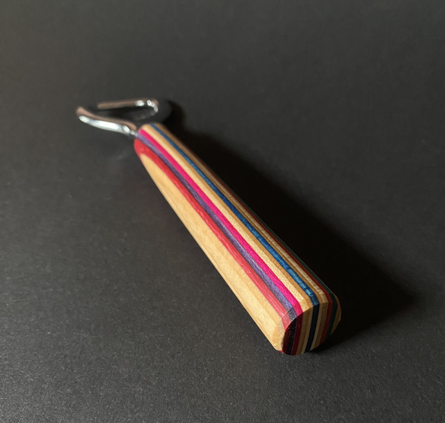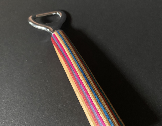 BLØPP is a bottle opener handcrafted from the wood of used skateboards. Each bottle opener is a unique piece, distinguished by its individual color combination.